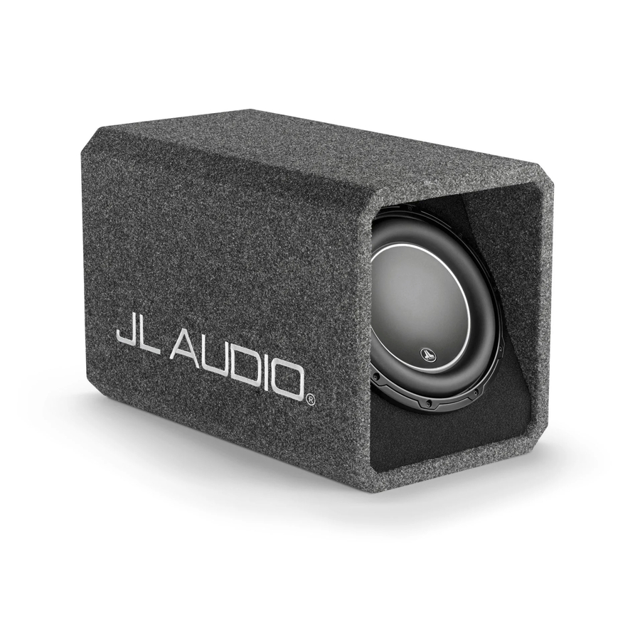 Finish: Dark gray, high-grade automotive carpet, with black carpet on woofer baffle. "JL AUDIO" is embroidered in silver on the side surface of the enclosure.