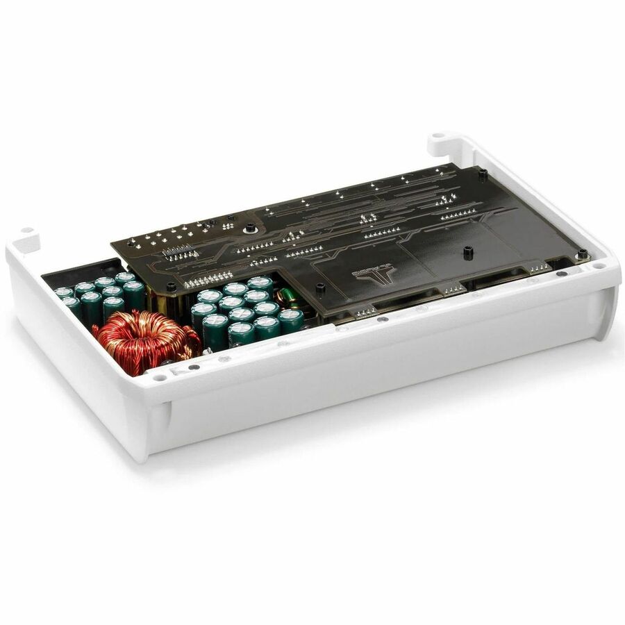 This marine amplifier features white and gray powder-coat finishes, a gasketed cover for the controls and stainless steel hardware for durability in the marine environment.