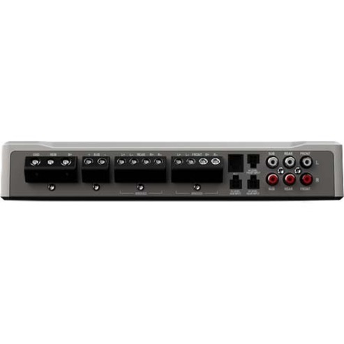 Designed to withstand the elements, the R2-750X5 amplifier is an Element Ready™ 750 rated power, full-range class-D model, capable of operating at 4? or 2? stereo, and 4? bridged/mono with a subwoofer channel that can be run at 4? or 2?. This amplifier is extremely efficient because of its class D technology which reduces demand on the electrical system. The amp also features C.L.E.A.N. circuitry to help you adjust your gain settings, a P.O.W.E.R. Supply that generates more power as voltage increases, and integrated Punch EQ that corrects for acoustic deficiencies while delivering up to 3X the bass.