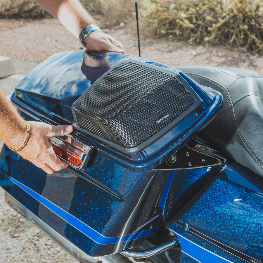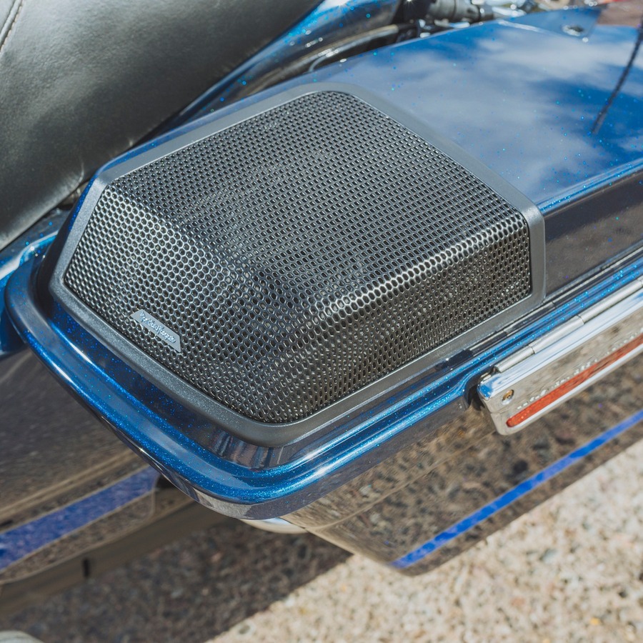 If you need more than just two speakers and want to really feel your music while riding then check out our add-on bag lid audio solution. Centered around our TMS69 6x9" speaker this kit is designed to work with existing OEM bag lids. This means no extra parts to purchase or custom paint schemes to match. Easy to install using our included cutting template and two-piece mounting system you can quickly add on to an existing or new fairing audio kit using with the included plug and play harness. This system is designed to plug directly into the Rockford Fosgate Power T400X4ad or TM400X4ad 4-channel amplifier. Not designed for factory amplifiers.